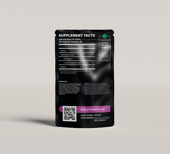 Tapioca Syrup, Sugar, Water, Mct Oil, Apple Pectin Powder, Natural Elderflower Flavor, Natural Black Tea Flavor, Citric Acid, Sodium Citrate, Malic Acid, (Proprietary Blend), Hemp Derived Cannabinol CBN, Emulsifiers, Olive Oil))., Natural Flavors, Sucralose, Potassium Citrate, Natural Shade Majestic Blue, Natural Shade Veggie Red.
